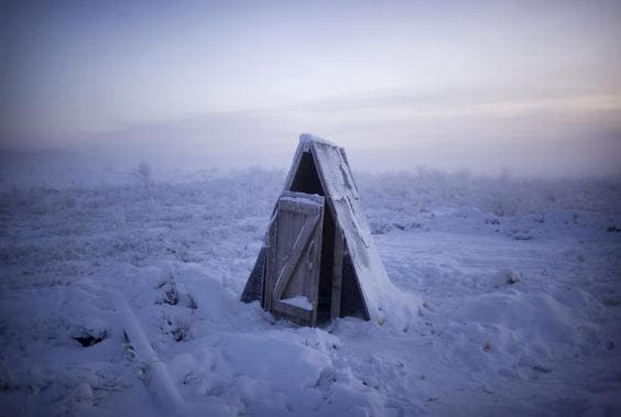 Une toilette recouverte de neige sur la toundra à un arrêt d’essence sur la route d’Oymyakon.