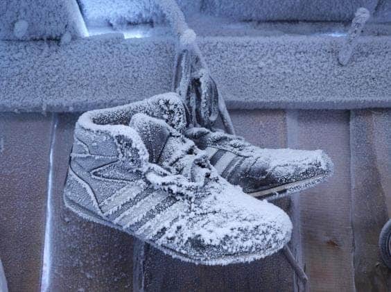 Des baskets congelés accrochés dans un hangar dans la banlieue de Yakutsk. Symbole que l’été n’est pas prêt de venir.