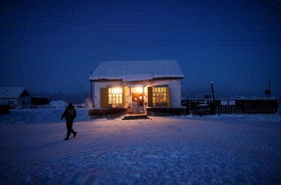 Un homme qui quitte sa camionnette pour entrer dans la seule boutique d’Omyakon.