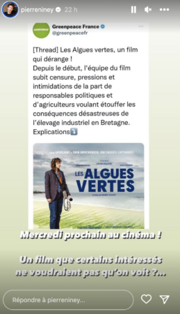 « Les Algues vertes, un film qui dérange ! Depuis le début, l’équipe du film subit ainsi censure, pressions. Et intimidations de la part de responsables politiques. Et d’agriculteurs voulant étouffer les conséquences désastreuses de l’élevage industriel en Bretagne » a écrit le compte Twitter de l’association.