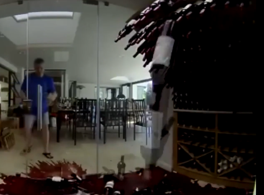 A travers une baie vitrée qui sépare sa salle à manger de sa cave, un homme assiste impuissant à une scène épouvantable : toutes ses bouteilles de vin tombent et se cassent !