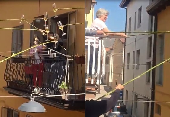 Le confinement n’empêche pas les Italiens de s’amuser en partagent ensemble une bonne bouteille avec les voisins. Ils ont même inventé des perches spéciales pour pouvoir trinquer.
