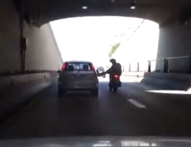Sans que l’on puisse savoir pourquoi, ce motard arrive par derrière, très furieux. Il s’en prend alors à une voiture en donnant un violent coup de pied à la portière. Malheureusement pour lui, le karma s’est très vite occupé de lui, car juste après son coup, il a perdu le contrôle de sa moto et a glissé sur la route. Comme quoi, le karma n’est jamais très loin pour nous rattraper !