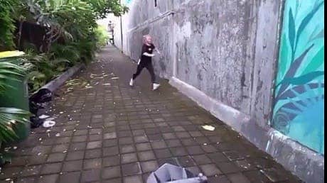 Une femme fait une parkour mais chute lourdement sur un scooter.