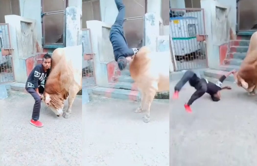 Voilà ce qui se passe quand on décide de tenir un taureau de ses cornes. Cet homme a cru qu’il avait la situation bien contrôlée en tenant un énorme taureau de ses cornes pour que ce dernier ne bouge pas.