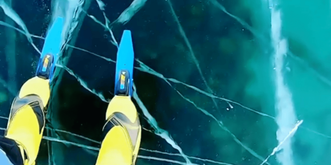 La scène a été filmée sur l’immense Lac Baïkal en Russie. Le patineur Alexey Kolganov a pris son courage à deux mains et a filmé ses pieds au dessus de la glace qui craque. Les bruits sont étonnants.
