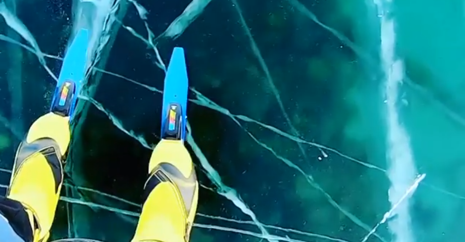 La scène a été filmée sur l’immense Lac Baïkal en Russie. Le patineur Alexey Kolganov a pris son courage à deux mains et a filmé ses pieds au dessus de la glace qui craque. Les bruits sont étonnants.