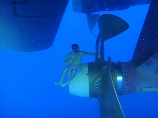 À chacun son kiffe durant une plongée. Ce n’est pas mal non plus de prendre la pause sur les hélices du bateau.