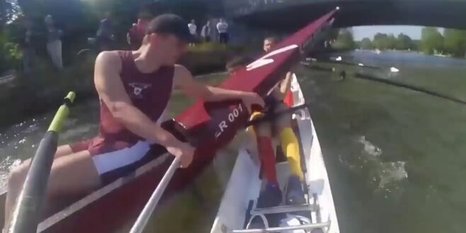 Une course d’aviron ui a faillit terminer très mal. Cet avironiste a failli être percuté par l’aviron adversaire.