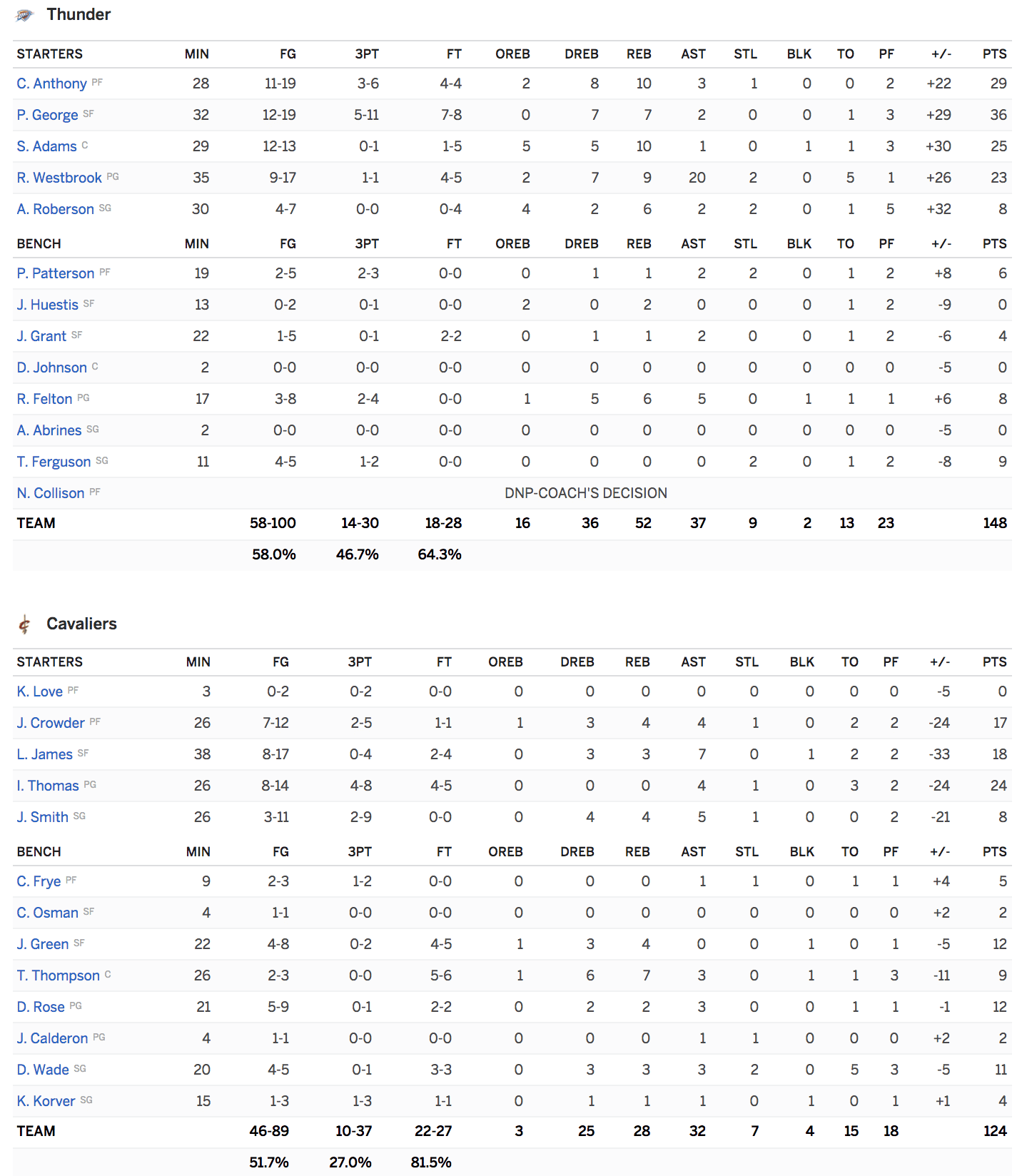 Malheureusement, la défense a été totalement absente, encaissant 148 points face à l’équipe de Russell Westbrook (23 pts, 9 rebonds et 20 passes !). Paul George (36 pts), Carmelo Anthony (29 pts, 10 rebonds) et Steven Adams (25 pts à 12/13) ont brillé pour le Thunder : 58% aux tirs pour équipe !