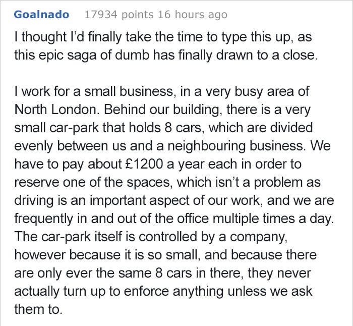 Le propriétaire d’une place de parking travaillait pour une petite entreprise, dans un quartier très animé du nord de Londres. Derrière le lieu de travail du propriétaire de la place, se trouvait un très petit parking qui contient 8 voitures. La place de parking coutait 1200 £ l’année.