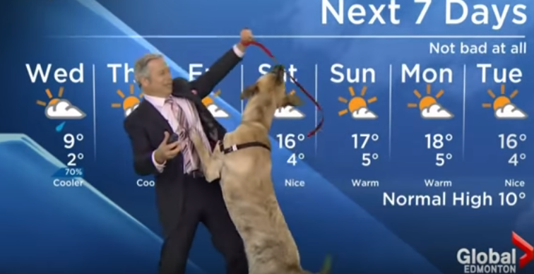 Global Edmonton est une chaîne de télé canadienne qui aime inviter des animaux sur son plateau. Le public a déjà eu droit à un chat ou à un chien. Rippla le chien était l’un d’entre eux. En présentant les prévisions de la météo, Mike Sobel a eu droit à une séquence mouvementée. L’animal ne cesse de le solliciter à jouer en mordant sa laisse, puis il se met à tirer et à donner du fil à retordre au présentateur qui tente de venir à bout de son émission. Mais au final Rippla finit par couper avec ses crocs la laisse et se met aussi tôt à sauter sur Mike.