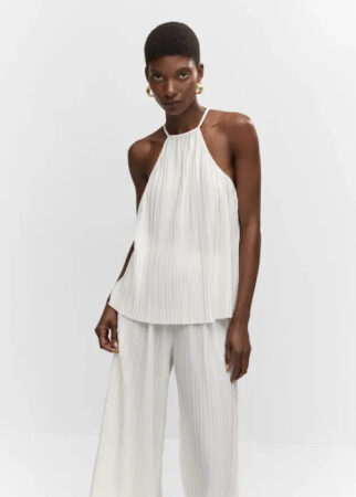 Mango mise sur la tendance du tissu plissé que l’on partout cette saison. Elle dévoile tout d’abord un top fluide avec un design très classe. Celui ci possède un col américain qui laisse apparaître les épaules de manière sensuelle.