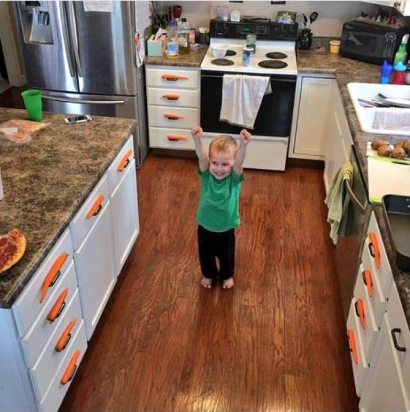 Cette photo est juste à se tordre de rire, surtout quand on voit la fierté du petit avec ce qu’il a fait avec les carottes.