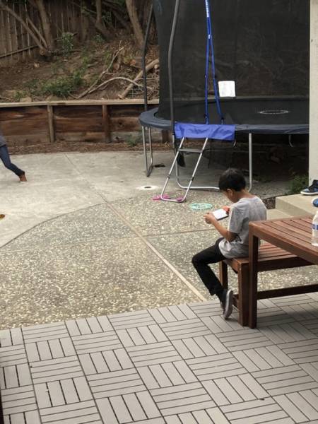 Jouer aux jeux vidéo à l’intérieur ou dehors de la maison, c’est du pareil au même pour ce petit garçon.