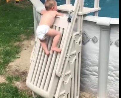 Ce bébé qui grimpe une échelle de sécurité d’une piscine très facilement et rapidement. Sans surveillance, la noyade aurait été inévitable pour ce petit. Faites donc attention si vous avez ce système !
