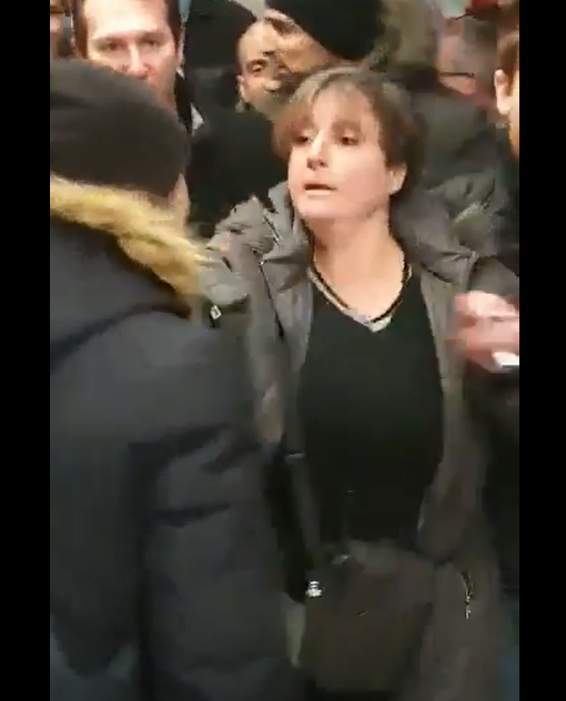 En rejoignant le train dont elle est responsable, cette femme a été accueillie par un groupe de personnes qui sifflait derrière elle. Les individus vont jusqu’à la pousser et à taper sur la rame. Les grévistes se mettent à siffler et à crier « elle a été vendue, elle a été vendue »