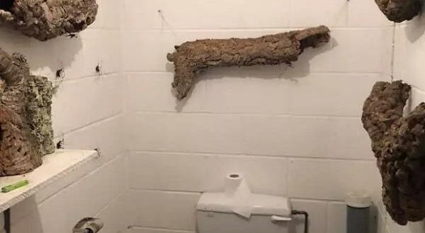 C’est le Spider Shop qui a décoré cette salle de bain avec des bûches d’arbres abritant des araignées fouet. Imaginez la scène de Harry Potter où Ron et Harry sont entourés d’araignées géantes. Sur les photos, des araignées fouet rampent sur les murs. Ces créatures se différencient des autres espèces, elles ne construisent pas de toiles et possèdent de longues griffes. D’après un biologiste, Kenneth Chapin, elles ont l’air terrifiantes mais sont en fait délicats, timides.