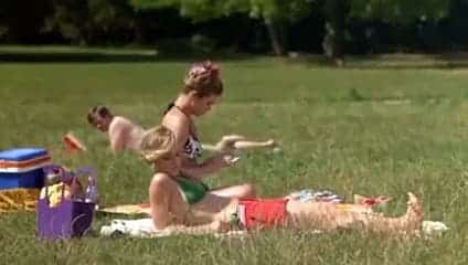 Un homme mignon est interpelé ces deux femmes qui sont en train de bronzer sur cette pelouse. Bonne au mauvaise idée ?