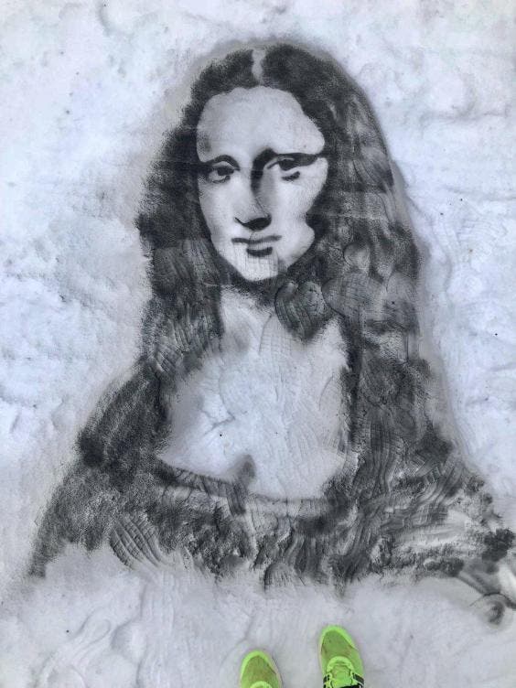 Puis il a aussi peint Mona Lisa. Pour créer ses magnifiques portraits, il gratte la neige pour révéler le sol en dessous. Ensuite il utilise de la peinture en aérosol pour les détails les plus fins.
