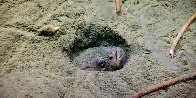 Cette vidéo remarquable nous donne l’occasion rare de documenter un événement de prédation dans la mer profonde, tout en mettant en évidence les liens trophiques entre les animaux qui vivent dans la colonne d’eau avec ceux qui vivent sur le fond marin. Ce poisson fouisseur était difficile à identifier pour les scientifiques, car il ressemble à la fois à un crapaud de mer et à un tordu.