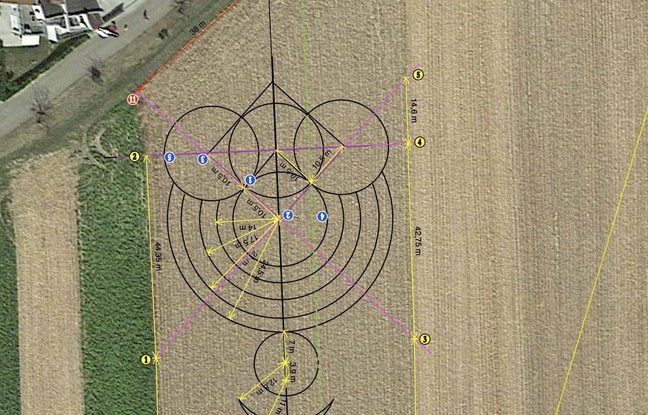 Dans le cadre d’un cours de géométrie appliquée, les élèves en classe de sixième du gymnase Jean-Sturm de Strasbourg ont dessiné un vrai crop circle de 150 mètres. Ceci à l’aide d’une boussole, de cordes, de bâtons et de “mètres”.