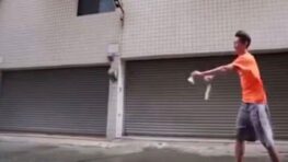 Il joue au badminton face aux vents violents du typhon Mangkhut