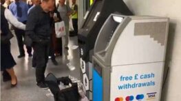 Un guichet automatique bancaire bitcoins crache des liasses de billets dans une gare