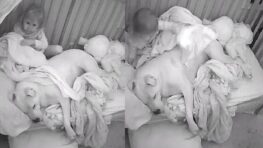 Cette petite fille essaye adorablement de couvrir son immense chien pitbull qui dort à côté d’elle
