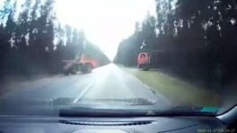 Une voiture roulant sur cette départementale en pleine foret ne voit pas le cable tendu entre ces deux camions et…