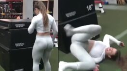 Une jeune femme a été filmée en vidéo essayant l’exercice du box jump dans une salle de sport. On peut…