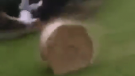 Ce garçon a pensé pouvoir sauter au-dessus d’une grosse botte de paille qui roulait sur une pente. Malheureusement, cette idée…