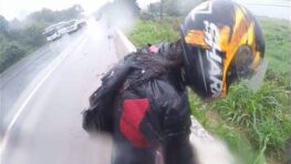 Un motard sauve sa copine lors d’un crash sur route mouillée.