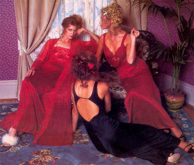 Dans le catalogue de 1979 les trois femmes sont représentées dans une luxueuse maison de banlieue. Elles font la lecture ou sont entrain de répondre au téléphone. Pantoufles à fourrure, des seins naturels, des mamelons visibles dans un décor très loin du glamour des clichés modernes, la marque vend un style de vie plutôt aisé.