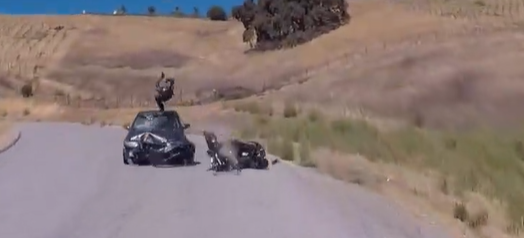 Cet automobiliste n’a pas vu la moto qui arrivait doit sur lui et le percute de plein fouet. La moto qui n’a pas eu le temps de faire son écart rentre dans l’avion de cette voiture. Le motard est éjecté en l’air et réalise un salto avant, avant de retomber sur le véhicule puis par terre. Choqué, il ne sera que légèrement blessé. Incroyable étant donné la violence du choc !