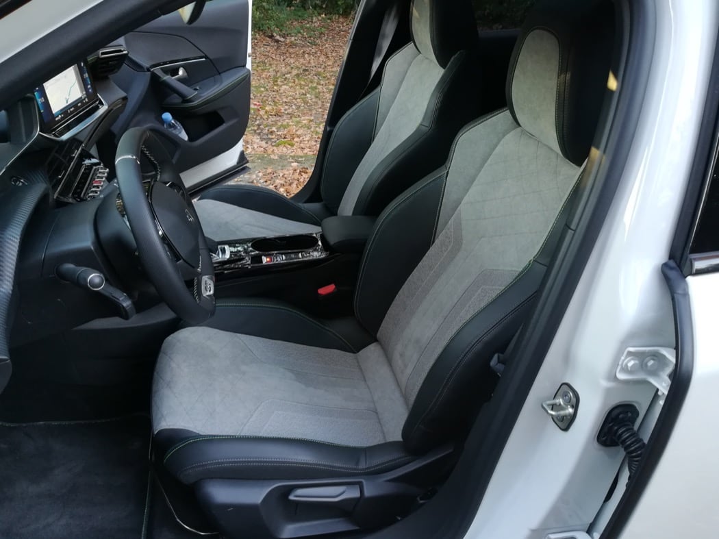 J’ai trouvé l’intérieur particulièrement réussi, avec une sellerie en alliance de cuir noir et d’alcantara gris surpiqué bleu et vert. De tout bôôôtéée !