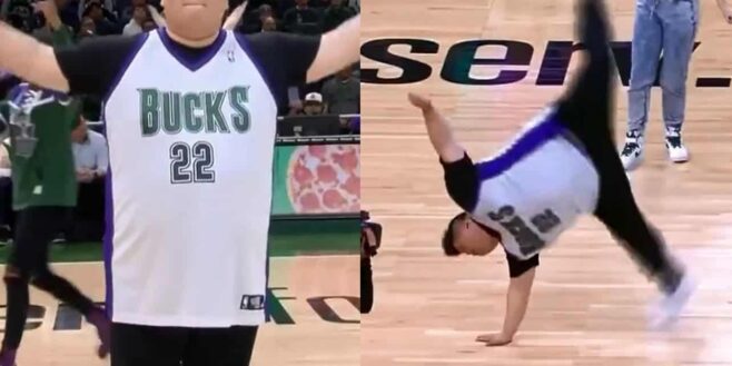 Durant la pause d’un match de Basket-ball en Amérique, un jeune homme s’est présenté dans le terrain et a commencé à se préparer pour danser.