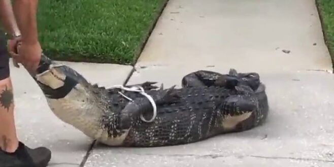 l’alligator était pourtant retenu par des attaches mais en le portant pour le mettre dans une remorque, celui-ci s’est débattu et le trappeur a fini KO par terre…