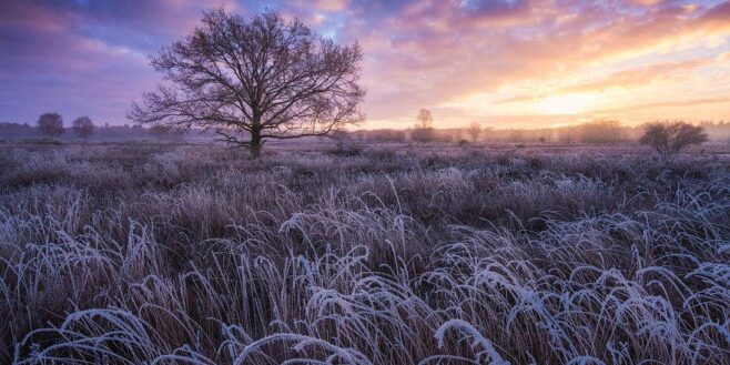 Du froid de l’hiver avec un paysage blanc d’une rareté, au magnifique lever de lune sur un champ de bruyère tout en violet. En passant par les premiers rayons du soleil qui touchent la brume matinale. Bref, une série de photos ressemblant à un rêve.