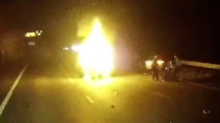 Une dashcam, installée à l’intérieur du camion de John Rastrick, a filmé le moment dramatique où la voiture est entrée en collision avec un autre véhicule et s’est enflammée.