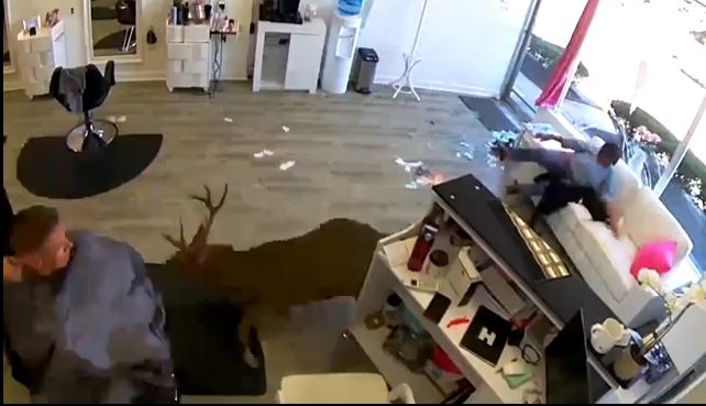 Un cerf a surpris des clients dans un salon de coiffure « Be.you.tiful Hair »à Lake Ronkonkoma, dans l’État de New York. L’animal sauvage a brisé la vitrine de l’établissement pour y entrer. Il a sauté par la fenêtre et a frappé une femme qui attendait sur le canapé du salon. La police affirme qu’elle a été blessée aux jambes et à la tête. Elle a été emmenée à l’hôpital avec des blessures ne mettant pas sa vie en danger. Le cerf était parti quand la police est arrivée.