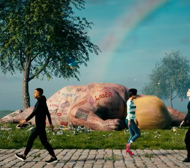 Cette œuvre fait partie des créations numériques qui sont de plus en plus en vogue en ce moment. Un énorme business a été érigé dans ce secteur, notamment suite à la crise sanitaire. Cette vidéo a été conçue par un artiste appelé Beeple et a été ensuite authentifiée grâce au système NFT ou Non-fungible-token. Dans cette séquence courte, il met en avant un géant qui rappelle Donald Trump et met en avant sa chute, avec un corps criblé par des slogans en tout genre.