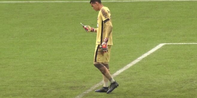 OKLM, ce gardien de but brésilien sort son phone en plein match.