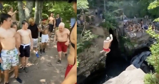 Alors que des jeunes se préparent, et hésitent encore à sauter du haut d’une falaise, un grand-père courageux décide de se lancer pour leur montrer comment on fait !