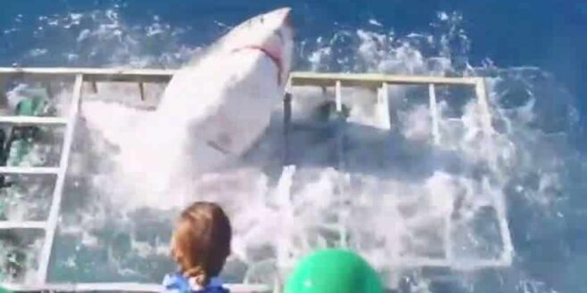 Un Grand Requin Blanc s’est invité dans une cage en métal plongée dans l’eau. Cette cage sert de lieu de pour les plongeurs qui veulent regarder les requins dans l’eau. On a frôlé le drone quand ce bestiau de 500 kg est entré dans la cage.