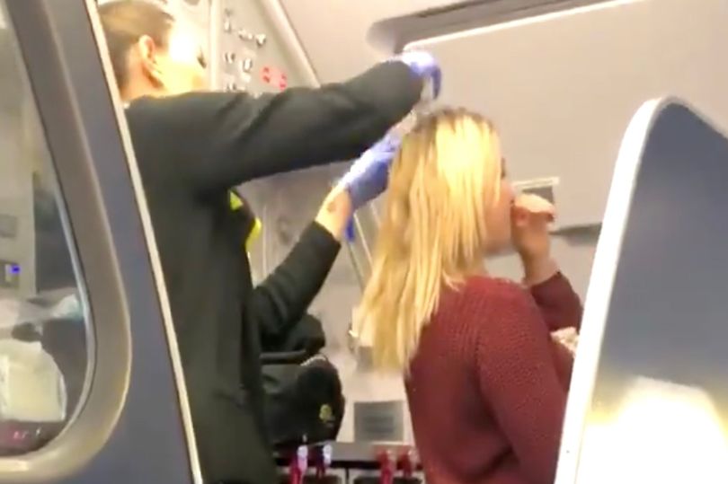 On peut y voir une hôtesse de l’air essayant d’aider la passagère, visiblement perturbée, à enlever le vomi sur sa tête.
