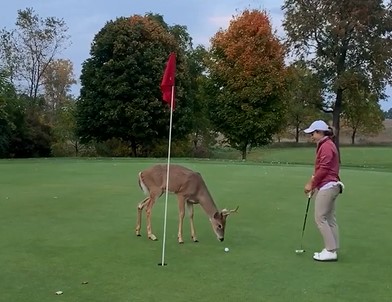 Sur un terrain de golf, un jeune cerf se trouve nez à nez avec une femme sur le point de marquer. Il semble intriguer et ne lâche pas la golfeuse et sa balle. Ce qui n’a pas empêché celle-ci d’envoyer la balle dans un trou.