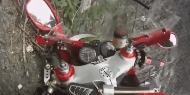 En pleine vitesse sur la route, ce motard a croisé soudainement un groupe de cyclistes faisant une embardée dans la circulation. Il a dû réagir rapidement, en virant à droite afin d’éviter un accident avec un des cyclistes qui a roulé sur sa voie. Résultat, il s’est écrasé, mais miraculeusement, il a survécu à l’accident.
