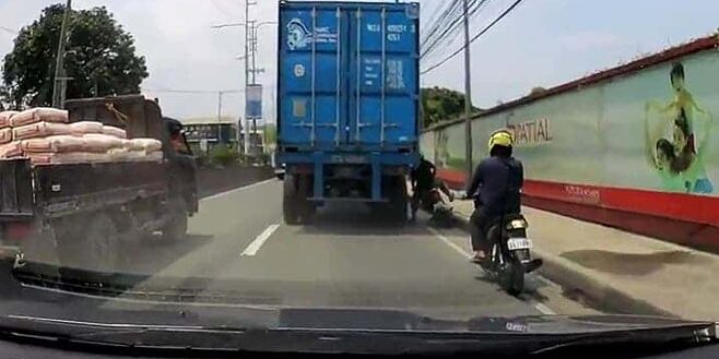 Ce motard peut remercier son casque de lui avoir sauvé la vie. On le ne félicitera pas de son geste pour doubler sur la droite.
