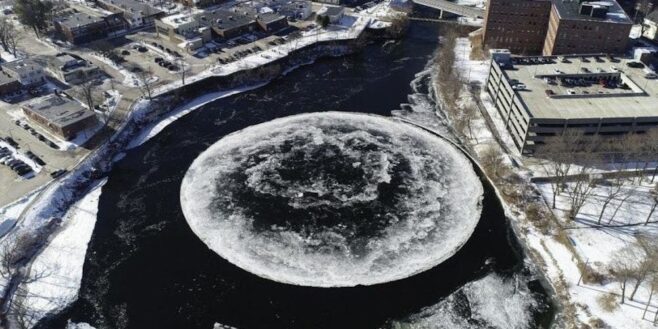 Le disque de glace est apparu sur la rivière Presumpscot à Westbrook, une ville de l’État du Maine (États-Unis). S’étendant sur près de 100 mètres de diamètres, il tourne sur lui-même à une vitesse de 6 km/h dans le sens inverse des aiguilles d’une montre.